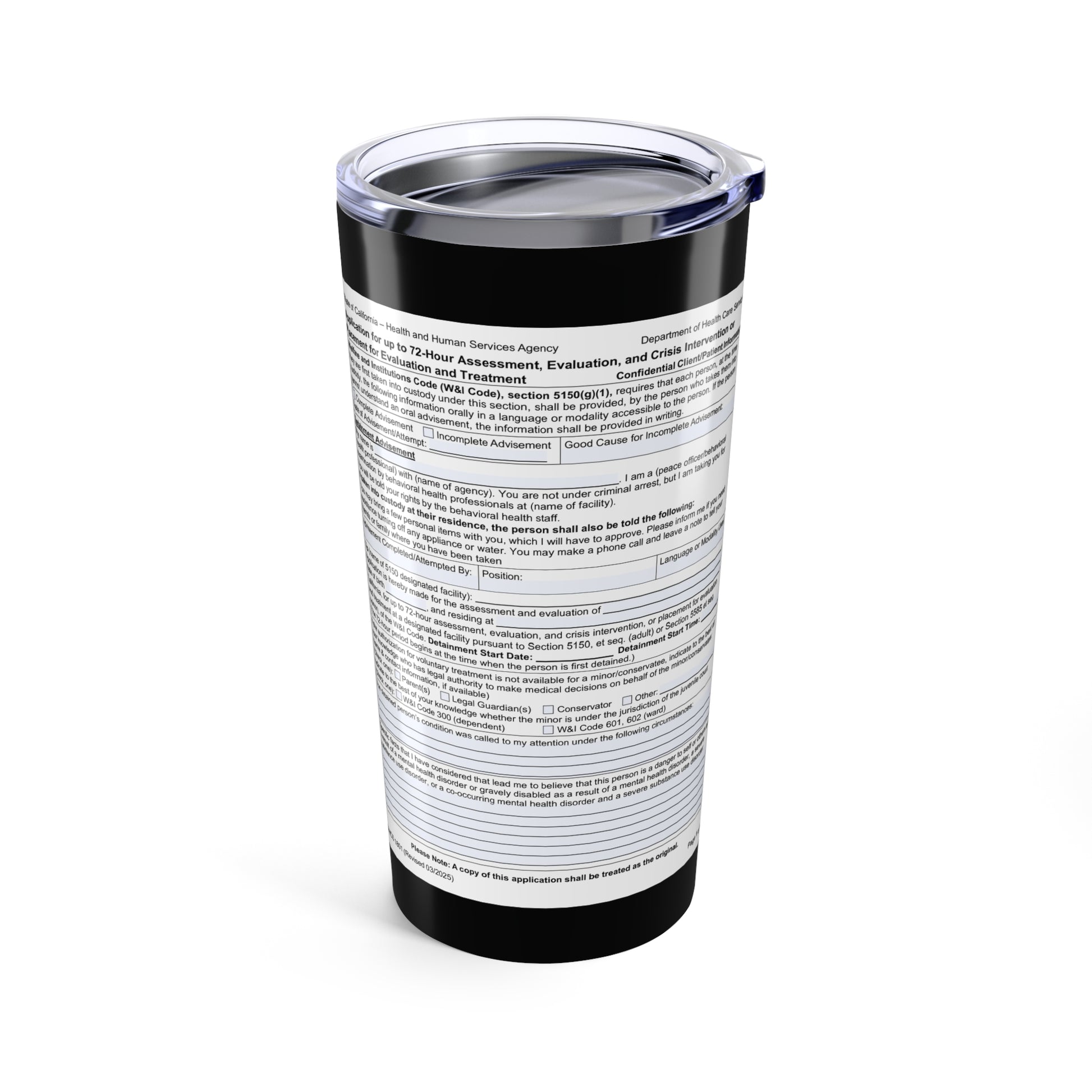 This 20oz stainless steel tumbler wears a cheeky twist on serious paperwork — the exact wording from California Welfare & Institutions Code 5150 printed across a glossy, full-wrap surface. It feels solid and weighty in hand, with double-wall vacuum insulation that keeps coffee steaming through morning rounds or iced drinks cold between appointments. The clear push-on lid with rubber gasket seals confidently for commutes and charting sessions, while the dishwasher-safe build stands up to the fast pace of clinical life. For clinicians, technicians, and mental health staff who use dark humor to get through long shifts, this tumbler becomes part of the routine: a small, wry reminder that the work is real, and so is the need for a dependable cup of something warm (or cold).